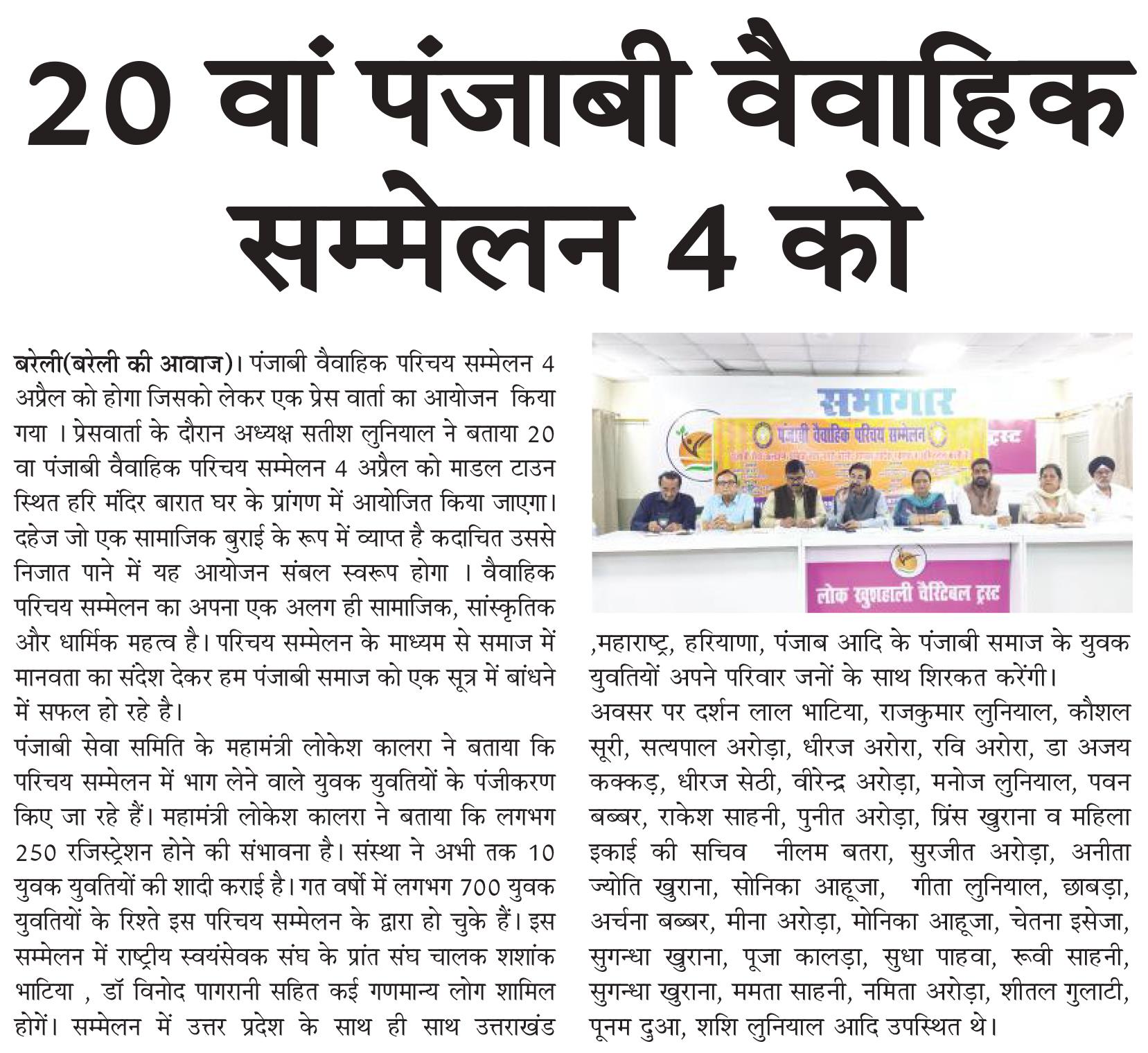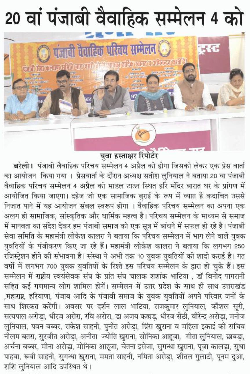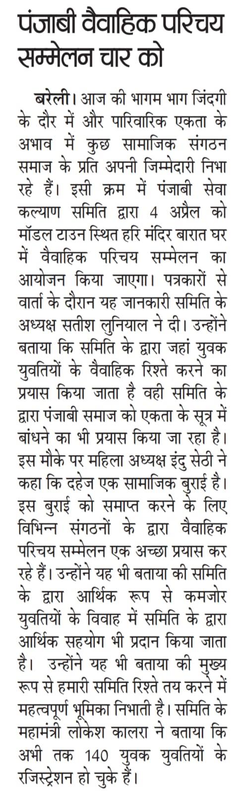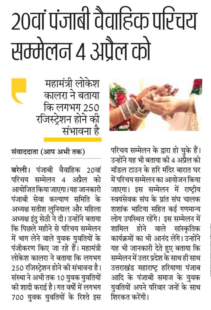 20वां पंजाबी वैवाहिक परिचय सम्मेलन 4 अप्रैल को महामंत्री लोकेश कालरा ने बताया कि लगभग 250 रजिस्ट्रेशन होने की संभावना है न्यूज़(आप अभी तक ) Read more