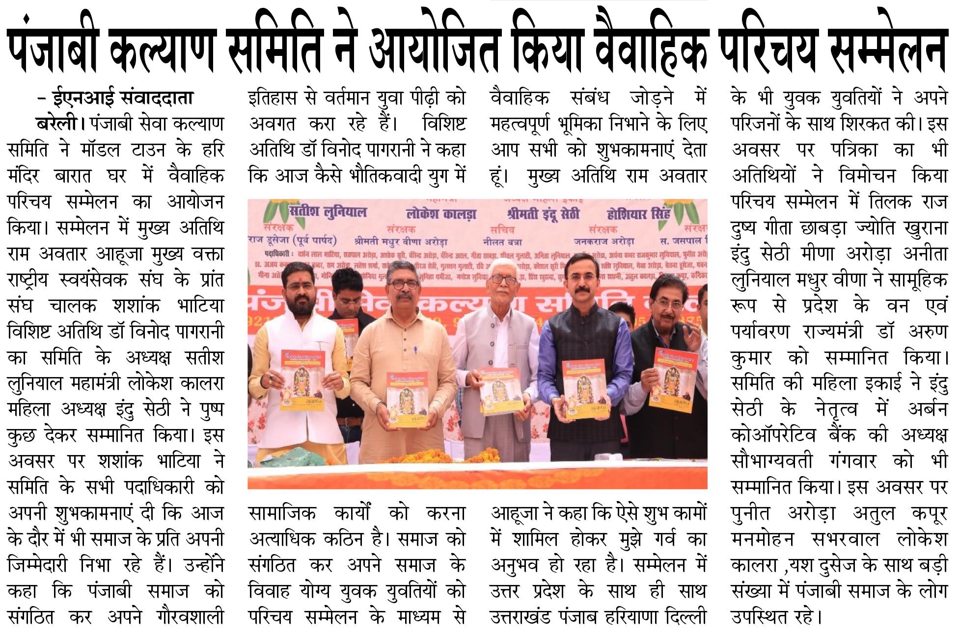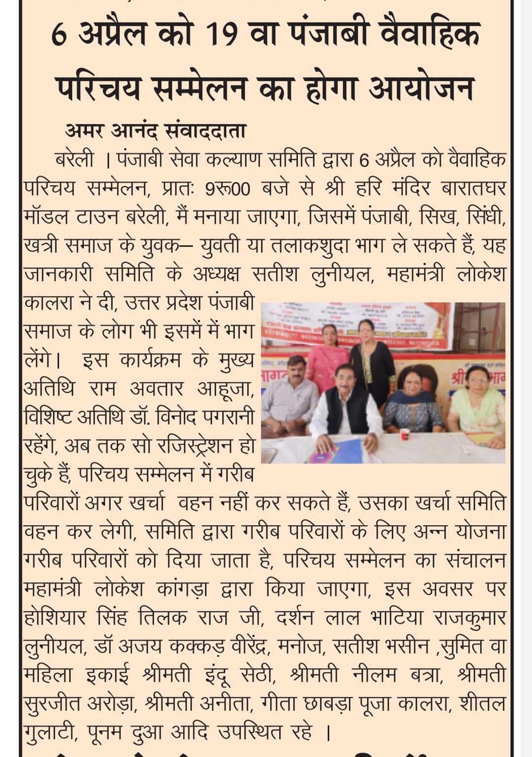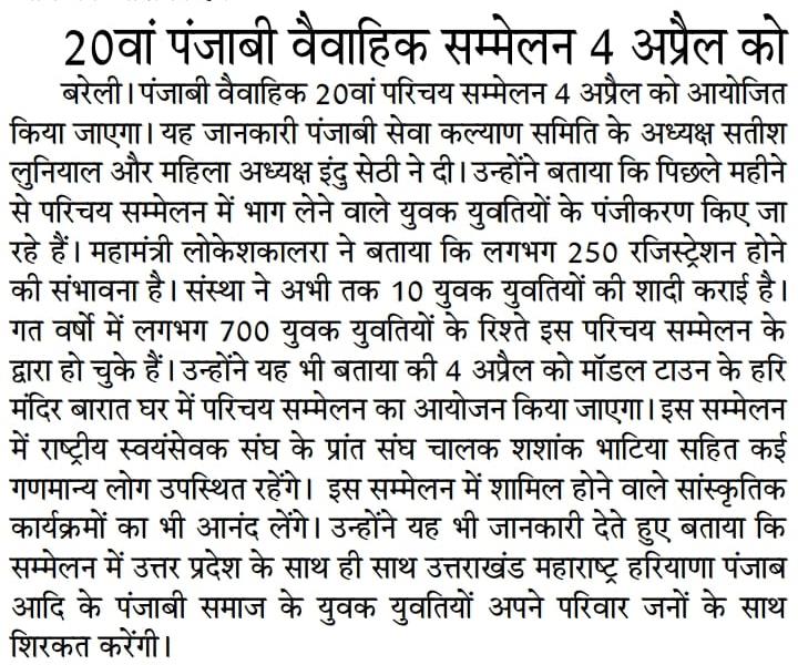 20वां पंजाबी वैवाहिक परिचय सम्मेलन 4 अप्रैल को महामंत्री लोकेश कालरा ने बताया कि लगभग 250 रजिस्ट्रेशन होने की संभावना है न्यूज़(आप अभी तक ) Read more